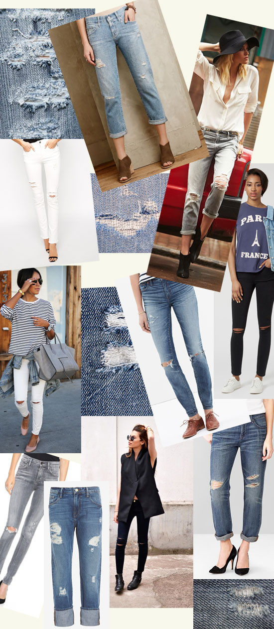 I know there are various opinions on ripped jeans. Some people (me!) totally love them while others think they look too ‘messy’ or ‘grungy.’ I do agree there are types of ripped denim that are TOO ripped, but if you get a pair with just the right amount of rips in all the right places, you’re good to go. We all wear jeans. We all probably have one too many pairs. If you’re looking for a way to add a little more excitement to an otherwise more basic denim collection, ripped jeans are the way to go. I pulled together loads of inspiration (including that amazing shot above – could that girl BE any cooler?) that are sure to change the minds of those who are on the fence about this style. Bonus: You can shop my favorite ripped jeans below by clicking the plus signs in the collage! Easy.