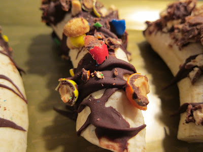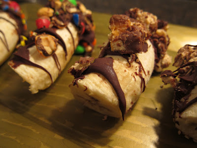 • One at a time, dip the banana halves into the chocolate and then into the candy of your choice.