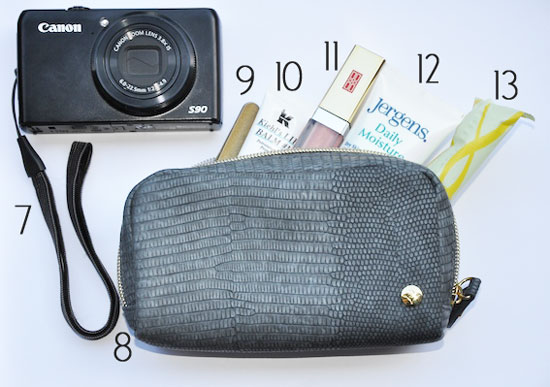 7. I don’t like carrying around my big camera with me because it’s rather bulky, so I always make sure to have this little guy for when I want to take pictures or film something on the go 8. I recently got this Stephanie Johnson cosmetics case and I just LOVE it. I think it’s the perfect size for all my lady essentials. 9. Tweezers because well, you just never know (and, uh, who else sometimes tweezes their eyebrows while in the car because that natural light is just glorious!) 10. No one wants chapped lips ,and this Kiehl’s lip balm is my favorite 11. It’s always good to have lip gloss on hand to touch up and I’m totally loving this Elizabeth Arden one these days 12. Just like no one wants chapped lips, no one wants dry hands, so Jergens is my go to, and how cute is this mini one? 13. Tampon because, again, you just never know.