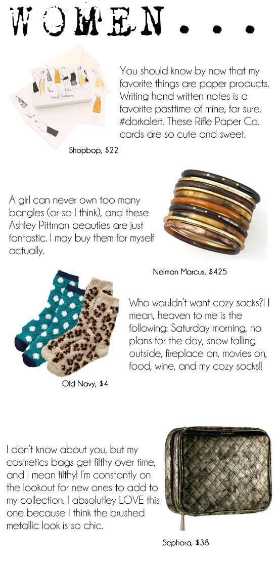 I’m back today with my second ‘gift guide’ and today it’s all about the ladies. So, if you’d like to not so discreetly leave this page open on your man’s computer as a ‘hint hint’ I’m ALL for that. Here’s my top 4! And, remember, all you have to do to purchase is click the little ‘plus signs’ within the collage or click the little images at the bottom. SO easy, my goodness! Oh, and if you want to check out yesterday’s men’s gift guide, click HERE.
